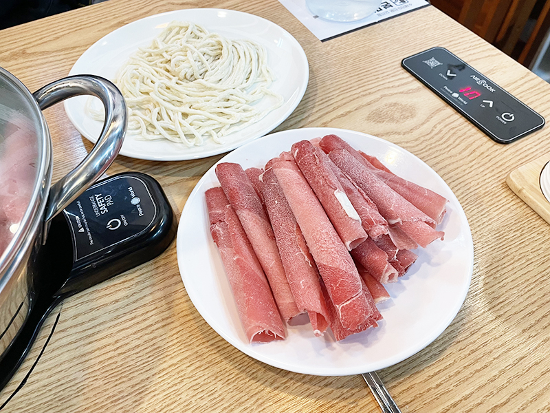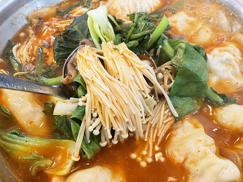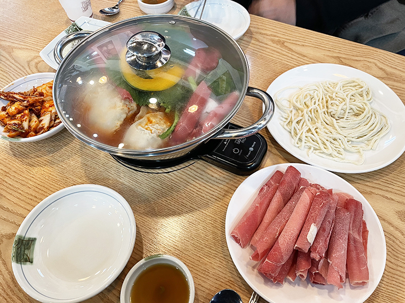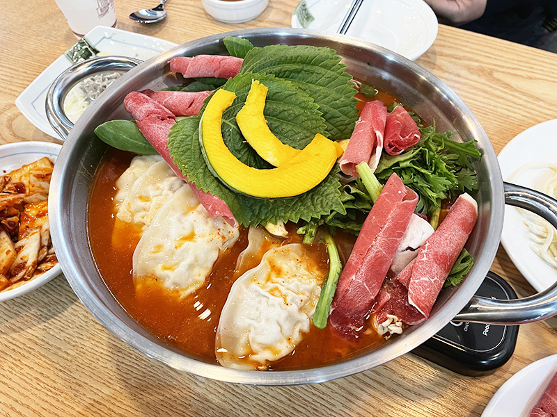 점심식사로 주문한 메뉴는 '얼큰 소고기 만두전골'