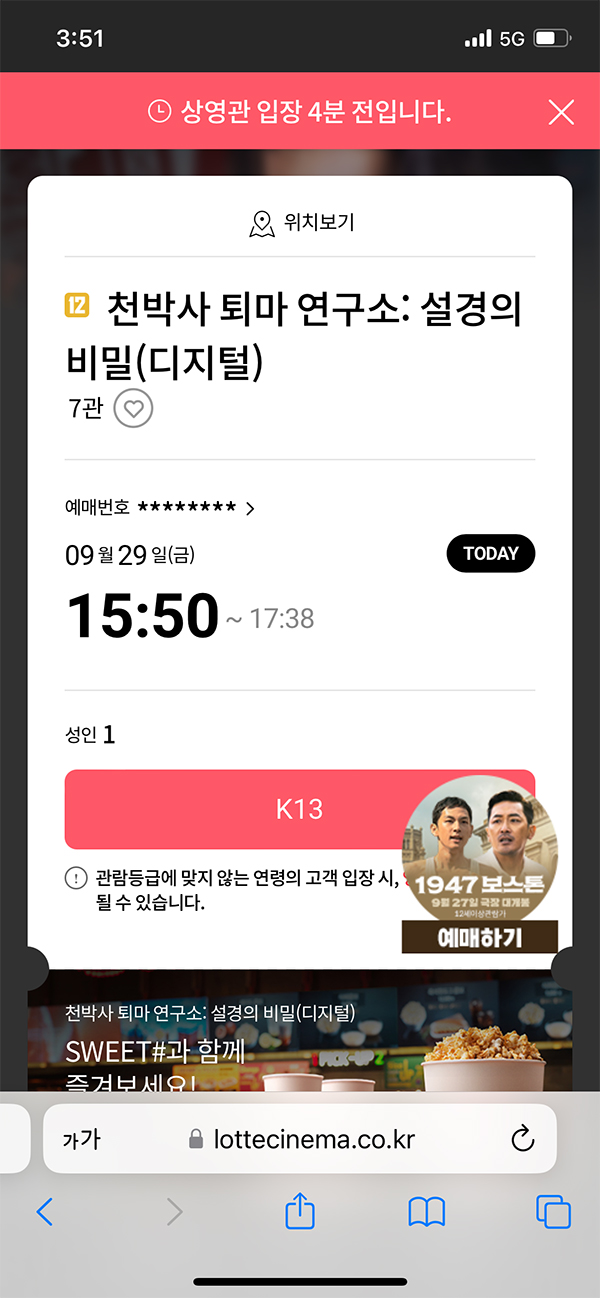 하루 정도는 가볍게 영화를 볼까 싶어 당일 예매를 했다.