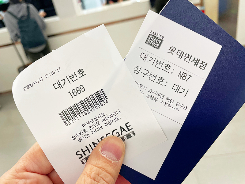 주문한 신세계면세점과 롯데면세점 대기번호표를 받아 들고,