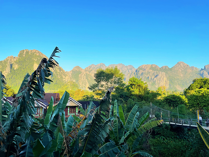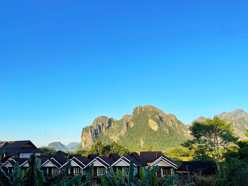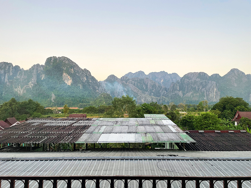 뭐~ 그 덕에 일찍 일어나 커튼을 치니, 이곳이 방비엥이라는 것을 실감 나게 해주는 아침 풍경!