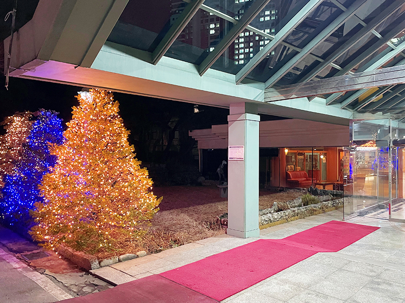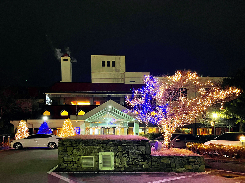 호텔로 돌아왔는데, 조명장식이 된 호텔 밤 풍경이 나름 분위기 있고 예쁘네~