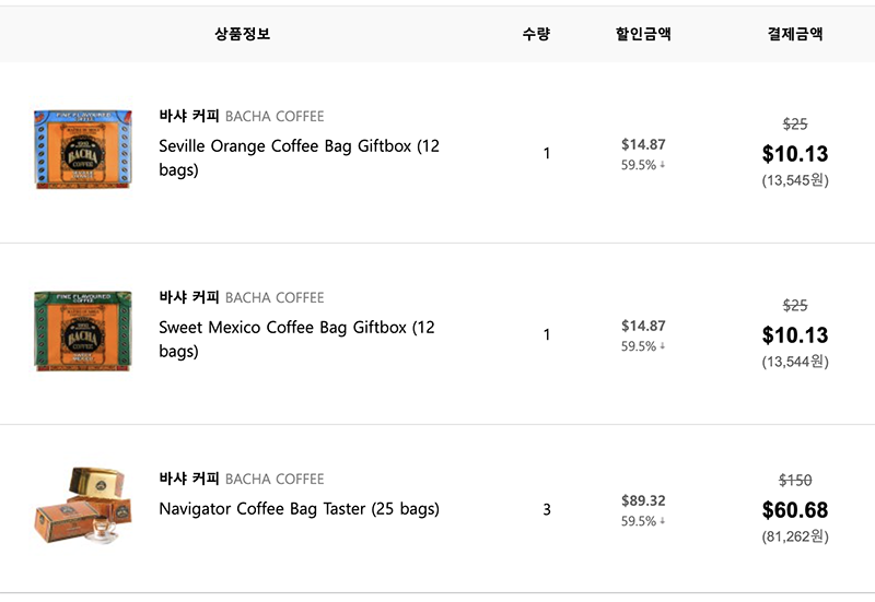 바샤 커피 드립백 12개입 박스가 우리나라에선 3만 원 대 후반에 판매되고 있고