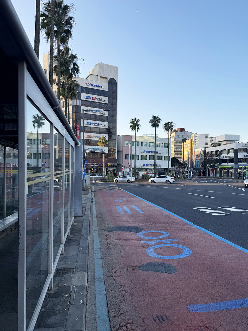 제주국제공항으로 가는 버스를 타기 위해 걸어서 10분 거리 서귀포 중앙로터리 버스승강장으로...