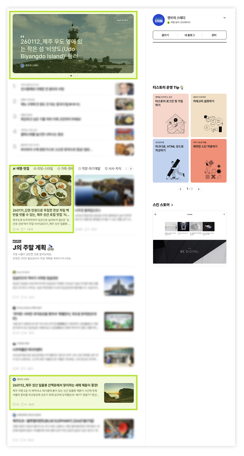 260201_티스토리(Tistory) 메인 '오늘의 티스토리', '여행 · 맛집', 'J의 주말 계획' 까지 3단 콤보 노출이라니...