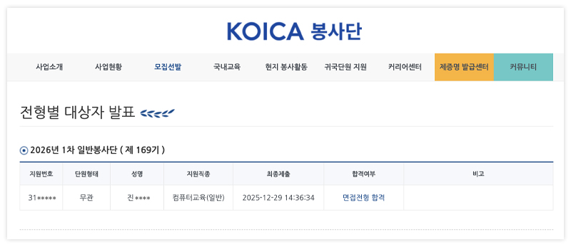2월 24일, 코이카(KOICA) 해외 일반 봉사단 169기 2차 전형인 면접전형 결과가 발표됐다.